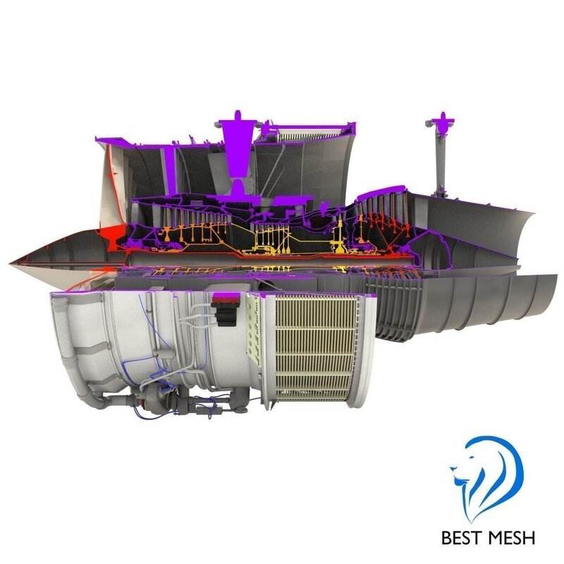 Very high detailed cutaway 3d model of a D-18T turbofan engine. The Progress D-18T is a three-shaft, high-bypass turbofan engine designed to power very large transport aircraft. It is the engine used by Antonov An-124 and Antonov An-225.
